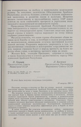 Ответная телеграмма Президента ОАР Гамаля Абдель Насера Председателю Совета Министров СССР Н.С. Хрущеву и Председателю Президиума Верховного Совета СССР Л.И. Брежневу. 13 августа 1962 г.