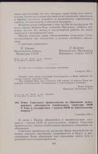 Ответная телеграмма Президента Ганы Кваме Нкрума Председателю Совета Министров СССР Н.С. Хрущеву и Председателю Президиума Верховного Совета СССР Л.И. Брежневу. 6 августа 1962 г. // Печат. по арх. Опубл. в газ. «Правда», № 222 (16078), 10 августа 1962 г.