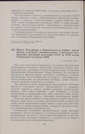 Проект Декларации о переключении на мирные нужды средств и ресурсов, высвобождаемых в peзyльтaтe разоружения, внесенный делегацией СССР на XVII сессии Генеральной Ассамблеи ООН. 21 сентября 1962 г. // Печат. по арх. Опубл. в газ. «Правда», № 267 (16123), 24 сентября 1962 г.