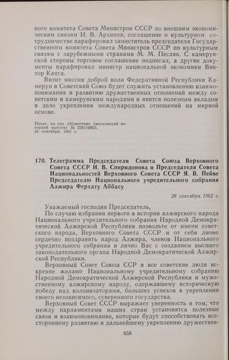 Телеграмма Председателя Совета Союза Верховного Совета СССР И.В. Спиридонова и Председателя Совета Национальностей Верховного Совета СССР Я.В. Пейве Председателю Национального учредительного собрания Алжира Ферхату Аббасу. 26 сентября 1962 г.