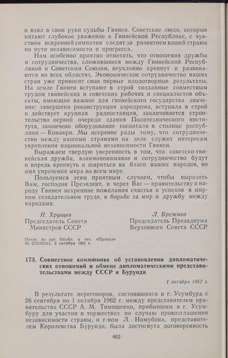Совместное коммюнике об установлении дипломатических отношений и обмене дипломатическими представительствами между СССР и Бурунди. 1 октября 1962 г. // Печат. по арх.