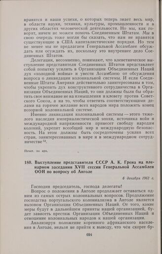 Выступление представителя СССР А.К. Грена на пленарном заседании XVII сессии Генеральной Ассамблеи ООН по вопросу об Анголе. 6 декабря 1962 г. // Печат. по арх.