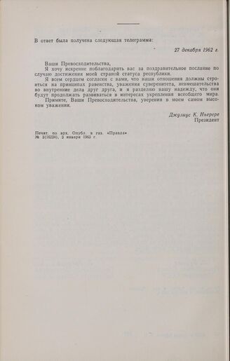 Ответная телеграмма Президента Танганьики Юлиуса Камбарадже Ньерере Председателю Совета Министров СССР Н.С. Хрущеву и Председателю Президиума Верховного Совета СССР Л.И. Брежневу. 27 декабря 1962 г. // Печат. по арх. Опубл. в газ. «Правда» № 3 (16224), 3 января 1963 г.