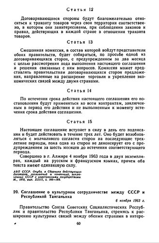 Соглашение о культурном сотрудничестве между СССР в Республикой Танганьика. 6 ноября 1963 г. // АВП СССР. Опубл. в Сборнике действующих договоров, соглашений и конвенций, заключенных СССР с иностранными государствами. М., 1970, вып. XXIII, с. 627-629.
