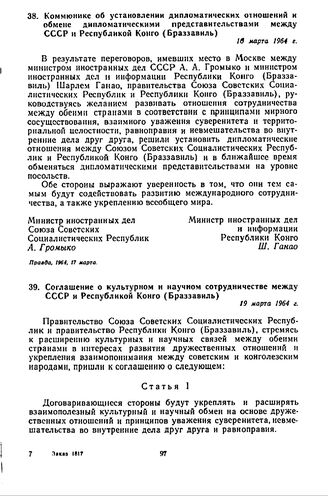 Соглашение о культурном и научном сотрудничестве между СССР и Республикой Конго (Браззавиль). 19 марта 1964 г. // АВП СССР. Опубл. в Сборнике действующих договоров, соглашений и конвенций, заключенных СССР с иностранными государствами. М., 1970, вып. XXIII, с. 618-620.