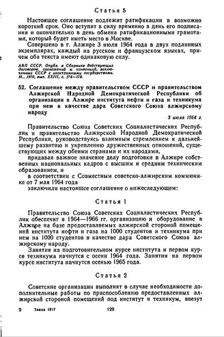 Соглашение между правительством СССР и правительством Алжирской Народной Демократической Республики об организации в Алжире института нефти и газа и техникума при нем в качестве дара Советского Союза алжирскому народу. 3 июля 1964 г. // АВП СССР. Опубл. в Сборнике действующих договоров, соглашений и конвенций, заключенных СССР с иностранными государствами. М., 1970, вып. XXIII, с. 178-180.