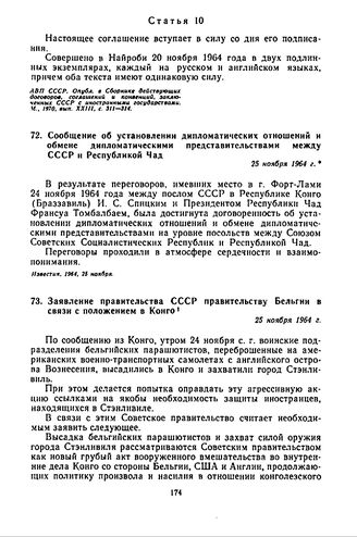 Сообщение об установлении дипломатических отношений и обмене дипломатическими представительствами между СССР и Республикой Чад. 25 ноября 1964 г.
