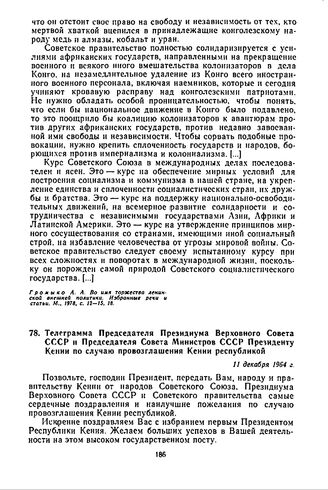 Телеграмма Председателя Президиума Верховного Совета СССР и Председателя Совета Министров СССР Президенту Кении по случаю провозглашения Кении республикой. 11 декабря 1964 г. // Правда, 1964, 12 декабря.