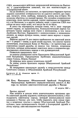 Речь Президента Объединенной Арабской Республики, Председателя Арабского социалистического союза Г.А. Насера на митинге советско-египетской дружбы в Москве. 31 августа 1965 г.