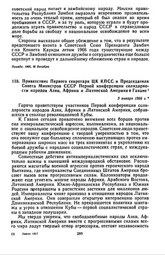 Приветствие Первого секретаря ЦК КПСС и Председателя Совета Министров СССР Первой конференции солидарности народов Азии, Африки и Латинской Америки в Гаване. 3 января 1966 г. // Правда, 1966, 3 января.