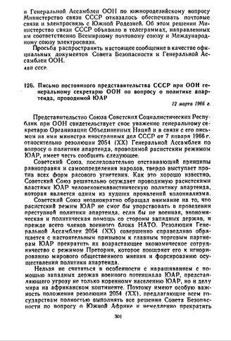 Письмо постоянного представительства СССР при ООН генеральному секретарю ООН по вопросу о политике апартеида, проводимой ЮАР. 12 марта 1966 г. // АВП СССР.