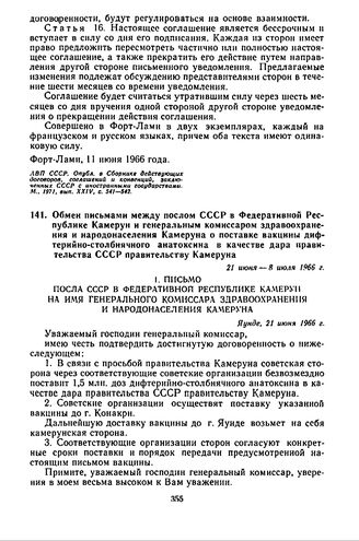 Обмен письмами между послом СССР в Федеративной Республике Камерун и генеральным комиссаром здравоохранения и народонаселения Камеруна о поставке вакцины дифтерийно-столбнячного анатоксина в качестве дара правительства СССР правительству Камеруна. 21 июня-8 июля 1966 г. // АВП СССР. Опубл. в Сборнике действующих договоров, соглашений и конвенций, заключенных СССР с иностранными государствами. М., 1971, вып. XXIV, с. 548-549.