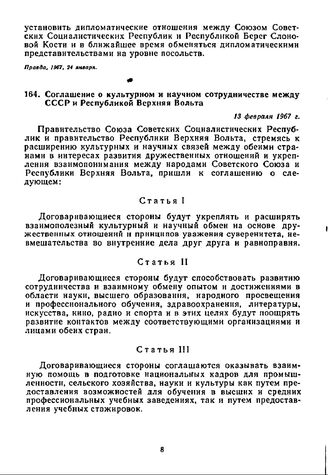 Соглашение о культурном и научном сотрудничестве между СССР и Республикой Верхняя Вольта. 13 февраля 1967 г. // АВП СССР. Опубл. в Сборнике действующих договоров, соглашений и конвенций, заключенных СССР с иностранными государствами. М., 1972, вып. XXV, с. 438-440.