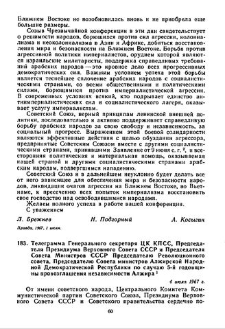 Телеграмма Генерального секретаря ЦК КПСС, Председателя Президиума Верховного Совета СССР и Председателя Совета .Министров СССР Председателю Революционного совета, Председателю Совета министров Алжирской Народной Демократической Республики по случаю 5-й годовщины провозглашения независимости Алжира. 4 июля 1967 г. // Правда, 1967, 5 июля.