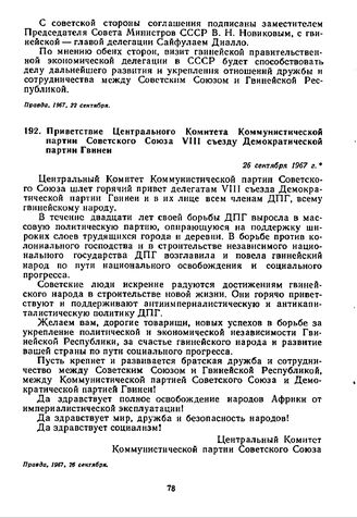 Приветствие Центрального Комитета Коммунистической партии Советского Союза VIII съезду Демократической партии Гвинеи. 26 сентября 1967 г. // Правда, 1967, 26 сентября.