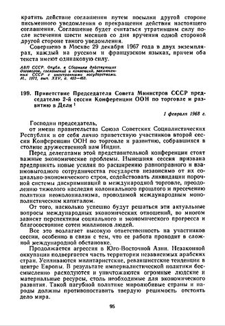 Приветствие Председателя Совета Министров СССР председателю 2-й сессии Конференции ООН по торговле и развитию в Дели. 1 февраля 1968 г. // Правда, 1968, 2 февраля.