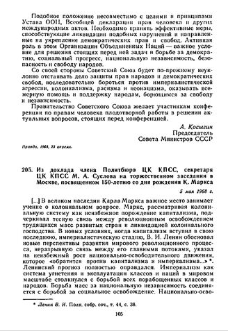 Из доклада члена Политбюро ЦК КПСС, секретаря ЦК КПСС М.А. Суслова на торжественном заседании в Москве, посвященном 150-летию со дня рождения К. Маркса. 5 мая 1968 г.