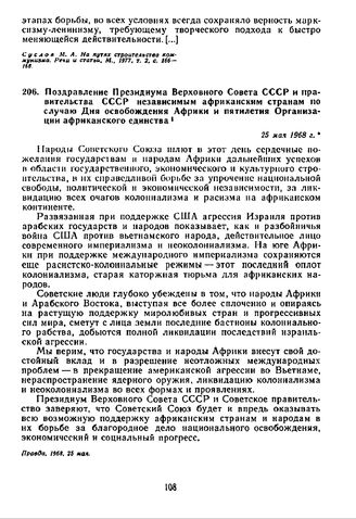 Поздравление Президиума Верховного Совета СССР и правительства СССР независимым африканским странам по случаю Дня освобождения Африки и пятилетия Организации африканского единства. 25 мая 1968 г. // Правда, 1968, 25 мая.