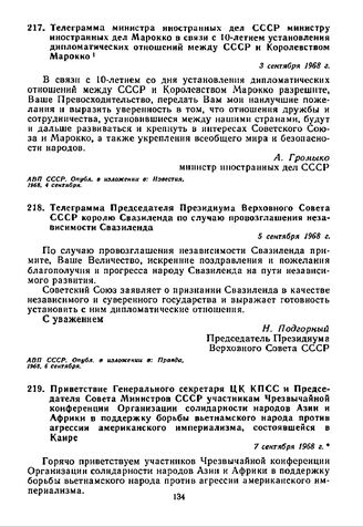 Телеграмма министра иностранных дел СССР министру иностранных дел Марокко в связи с 10-летием установления дипломатических отношений между СССР и Королевством Марокко. 3 сентября 1968 г. // АВП СССР. Опубл. в изложении в: Известия, 1968, 4 сентября.