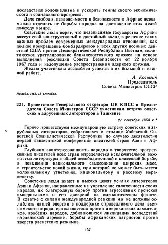Приветствие Генерального секретаря ЦК КПСС и Председателя Совета Министров СССР участникам встречи советских и зарубежных литераторов в Ташкенте. 21 сентября 1968 г.
