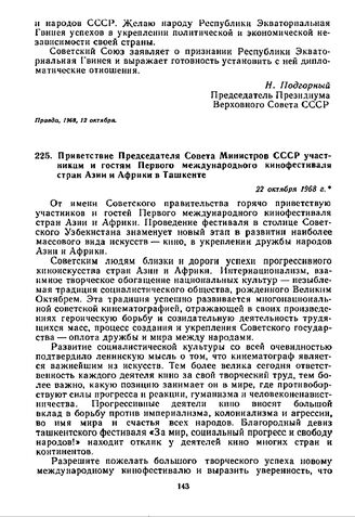 Приветствие Председателя Совета Министров СССР участникам и гостям Первого международного кинофестиваля стран Азии и Африки в Ташкенте. 22 октября 1968 г.