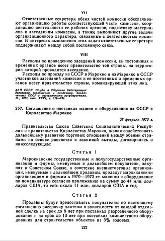 Соглашение о поставках машин и оборудования из СССР в Королевство Марокко. 27 февраля 1970 г. // АВП СССР. Опубл. в Сборнике действующих договоров, соглашений и конвенций, заключенных СССР с иностранными государствами. М., 1973, вып. XXVI, с. 131-133.