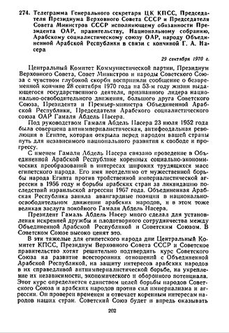 Телеграмма Генерального секретаря ЦК КПСС, Председателя Президиума Верховного Совета СССР и Председателя Совета Министров СССР исполняющему обязанности Президента ОАР, правительству. Национальному собранию. Арабскому социалистическому союзу ОАР, народу Объединенной Арабской Республики в связи с кончиной Г.А. Насера. 29 сентября 1970 г. // Правда, 1970, 30 сентября.