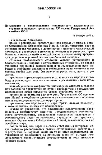 Декларация о предоставлении независимости колониальным странам и народам, принятая на XV сессии Генеральной Ассамблеи ООН. 14 декабря 1960 г. // ООН. Резолюции, принятые Генеральной Ассамблеей на XV сессии (20 сентября-20 декабря 1960 г.). Нью-Йорк. 1961, с. 74-75.