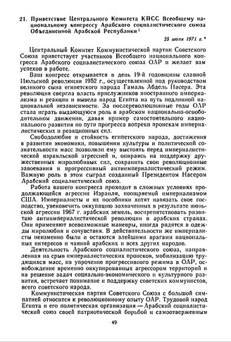 Приветствие Центрального Комитета КПСС Всеобщему национальному конгрессу Арабского социалистического союза Объединенной Арабской Республики. 25 июля 1971 г.