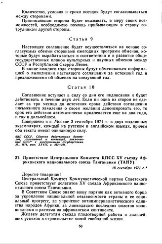 Приветствие Центрального Комитета КПСС XV съезду Африканского национального союза Танганьики (ТАНУ). 18 сентября 1971 г.