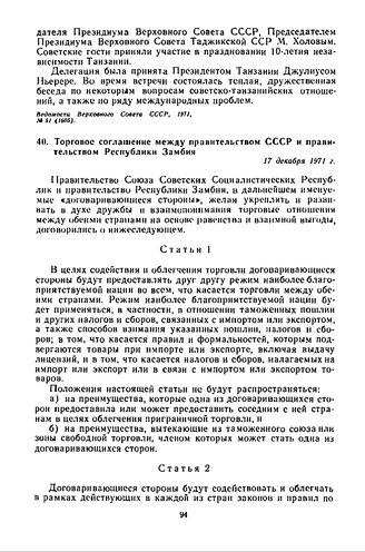 Торговое соглашение между правительством СССР и правительством Республики Замбия. 17 декабря 1971 г. // АВП СССР. Сборник действующих договоров, соглашений и конвенций, заключенных СССР с иностранными государствами. М., 1974, вып. XXVII, с.101-103.