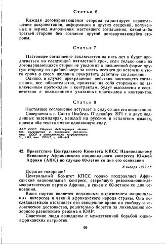 Приветствие Центрального Комитета КПСС Национальному Исполкому Африканского национального конгресса Южной Африки (АПК) по случаю 60-летия со дня его основания. 8 января 1972 г. // Правда, 1972, 8 января.