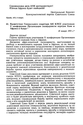 Приветствие Генерального секретаря ЦК КПСС участникам V конференции Организации солидарности народов Азии и Африки в Каире. 10 января 1972 г.