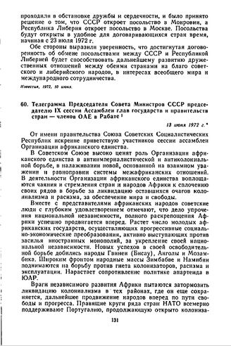 Телеграмма Председателя Совета Министров СССР председателю IX сессии Ассамблеи глав государств и правительств стран — членов ОАЕ в Рабате. 13 июня 1972 г. // Правда, 1972, 13 июня.