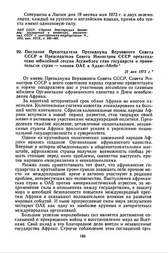 Послание Председателя Президиума Верховного Совета СССР и Председателя Совета Министров СССР председателю юбилейной сессии Ассамблеи глав государств и правительств стран — членов ОАЕ в Аддис-Абебе. 25 мая 1973 г. // Правда, 1973, 25 мая.