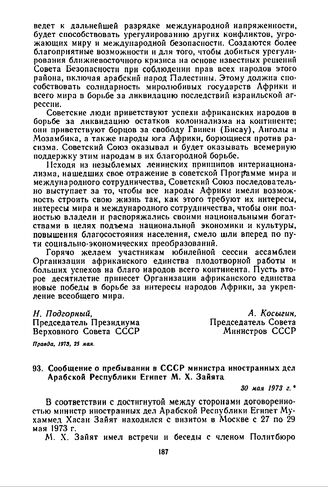 Сообщение о пребывании в СССР министра иностранных дел Арабской Республики Египет М.X. Зайята. 30 мая 1973 г. // Правда, 1973, 30 мая.