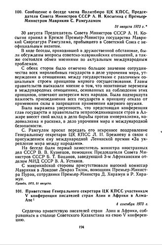 Приветствие Генерального секретаря ЦК КПСС участникам V конференции писателей стран Азии и Африки в Алма-Ате. 4 сентября 1973 г. // Брежнев Л.И. Ленинским курсом. М., 1974, т. 4, с. 261-262.