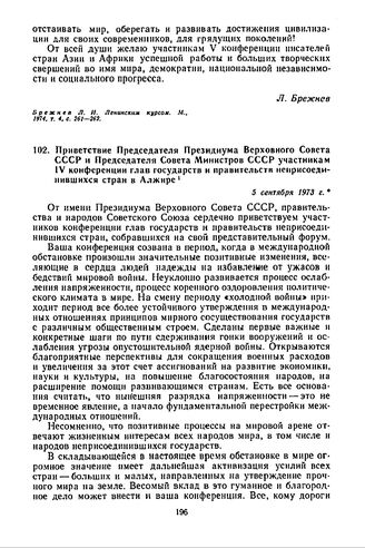 Приветствие Председателя Президиума Верховного Совета СССР и Председателя Совета Министров СССР участникам IV конференции глав государств и правительств неприсоединившихся стран в Алжире. 5 сентября 1973 г. // Правда, 1973, 5 сентября.