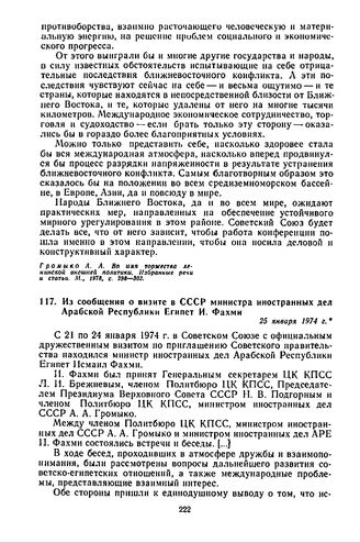 Из сообщения о визите в СССР министра иностранных дел Арабской Республики Египет И. Фахми. 25 января 1974 г. // Правда, 1974, 25 января.