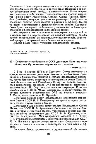 Сообщение о пребывании в СССР делегации Комитета освобождения Организации африканского единства. 11 апреля 1974 г. // Известия, 1974, 11 апреля.