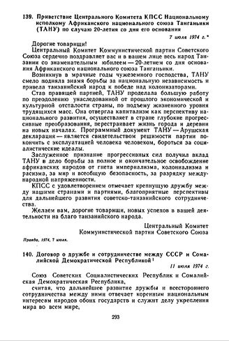 Приветствие Центрального Комитета КПСС Национальному исполкому Африканского национального союза Танганьики (ТАНУ) по случаю 20-летия со дня его основания. 7 июля 1974 г.