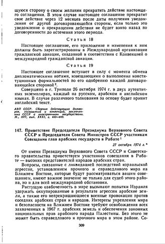 Приветствие Председателя Президиума Верховного Совета СССР и Председателя Совета Министров СССР участникам Совещания глав арабских государств в Рабате. 27 октября 1974 г. // Правда, 1974, 27 октября.