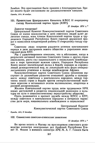 Приветствие Центрального Комитета КПСС II очередному съезду Конголезской партии труда (КПТ). 27 декабря 1974 г. // Правда, 1974, 27 декабря.