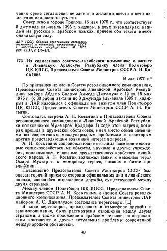 Из совместного советско-ливийского коммюнике о визите в Ливийскую Арабскую Республику члена Политбюро ЦК КПСС, Председателя Совета Министров СССР А.Н. Косыгина. 16 мая 1975 г. // Правда, 1975, 16 мая.