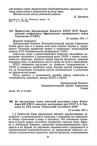 Приветствие Центрального Комитета КПСС XVII Национальной конференции Африканского национального союза Танганьики (ТАНУ). 22 сентября 1975 г.