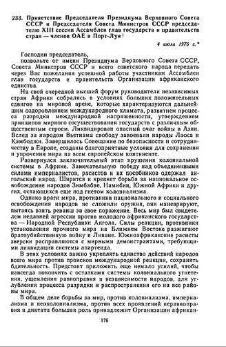 Приветствие Председателя Президиума Верховного Совета СССР и Председателя Совета Министров СССР председателю XIII сессии Ассамблеи глав государств и правительств стран — членов ОАЕ в Порт-Луи. 4 июля 1976 г.