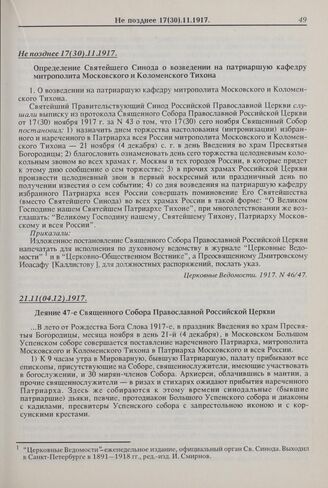 Определение Святейшего Синода о возведении на патриаршую кафедру митрополита Московского и Коломенского Тихона. Не позднее 17(30).11.1917 г.