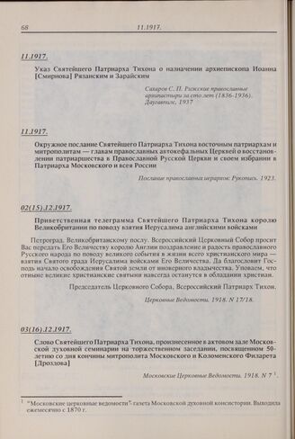 Слово Святейшего Патриарха Тихона, произнесенное в актовом зале Московской духовной семинарии на торжественном заседании, посвященном 50-летию со дня кончины митрополита Московского и Коломенского Филарета [Дроздова]. 03(16).12.1917 г. // Московские Церковные Ведомости. 1918. № 7.