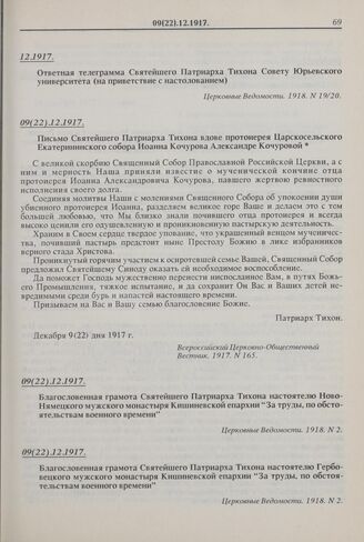 Благословенная грамота Святейшего Патриарха Тихона настоятелю Ново-Нямецкого мужского монастыря Кишиневской епархии «За труды, по обстоятельствам военного времени». 09(22).12.1917 г. // Церковные Ведомости. 1918. № 2.
