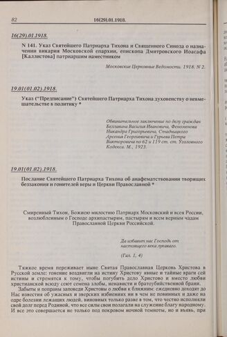 Послание Святейшего Патриарха Тихона об анафематствовании творящих беззакония и гонителей веры и Церкви Православной. 19.01(01.02).1918 г. // Введенский А. Церковь и государство: очерк взаимоотношении 1918-1922. М., 1923.; Утро России. 1918.; Листовка. М., 1918.; Церковные Ведомости. 1918. № 2.